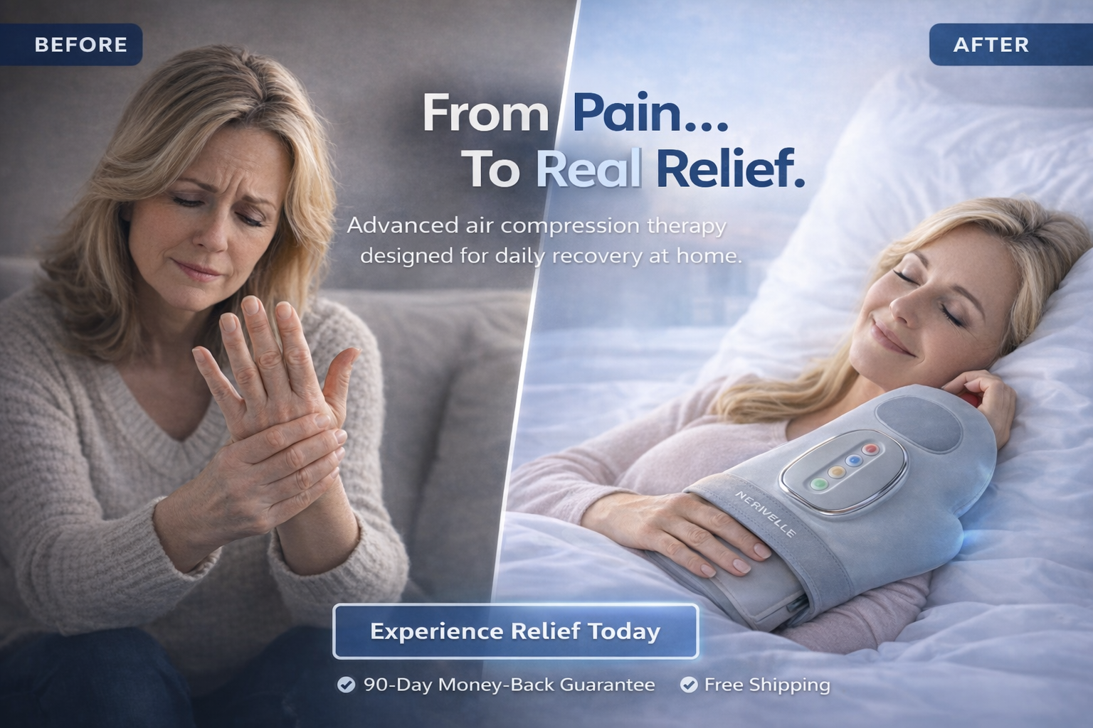 Transform the way your hands feel in only minutes a day. The Nerivelle Hand Massager is designed to reduce stiffness, ease discomfort, and restore flexibility with advanced heat therapy and precision air compression.
